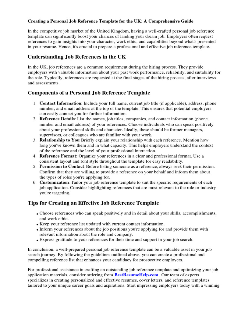 Personal Job Reference Template Uk PDF Employment Résumé